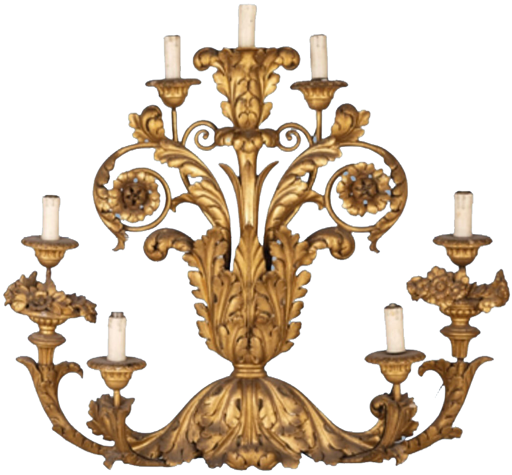 Candelabro monumentale in legno dorato, XVIII secolo. Intaglio ricco e scenografico, di forte impatto decorativo.