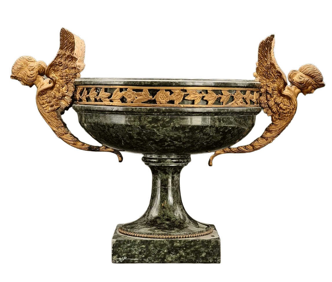 Coppa ornamentale in marmo serpentino con inserti in bronzo, XIX secolo. Oggetto decorativo di gusto neoclassico, destinato ad ambienti di rappresentanza.