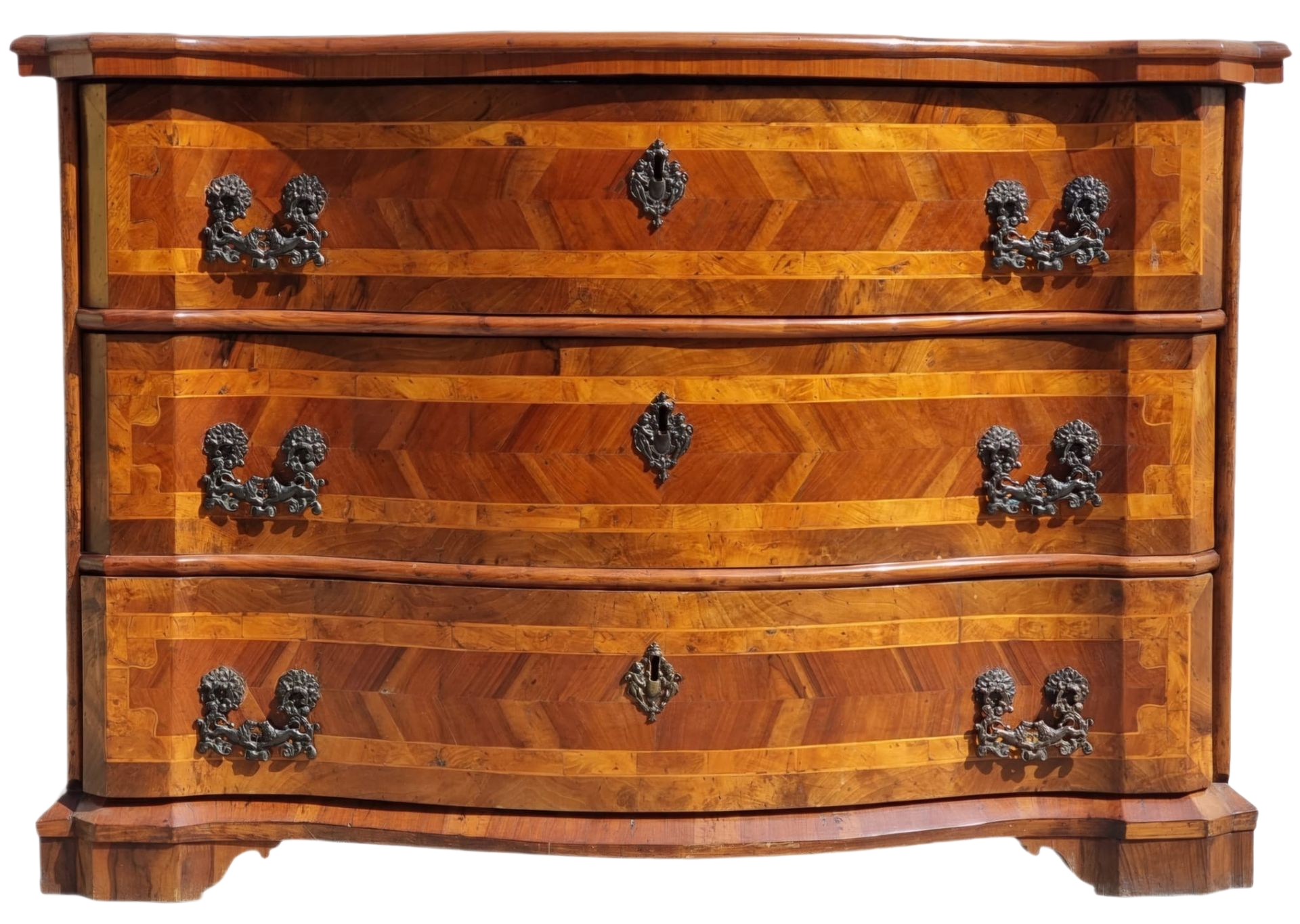 Comò sagomato, area veneta, prima metà del XVIII secolo. Lastronato in noce con raffinata spinatura e filettature in legni chiari.